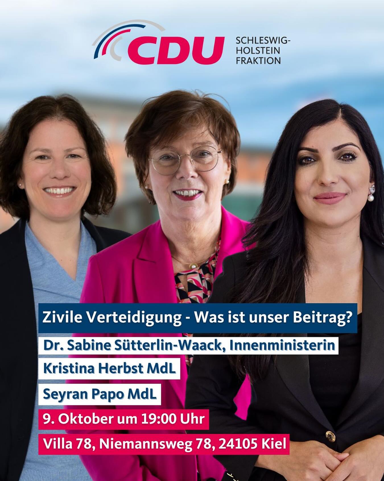 Zusammen mit Seyran Papo MdL möchte ich mit Innenministerin Sabine Sütterlin-Waack zum Thema Zivile Verteidigung – Was ist unser Beitrag? ins Gespräch kommen.